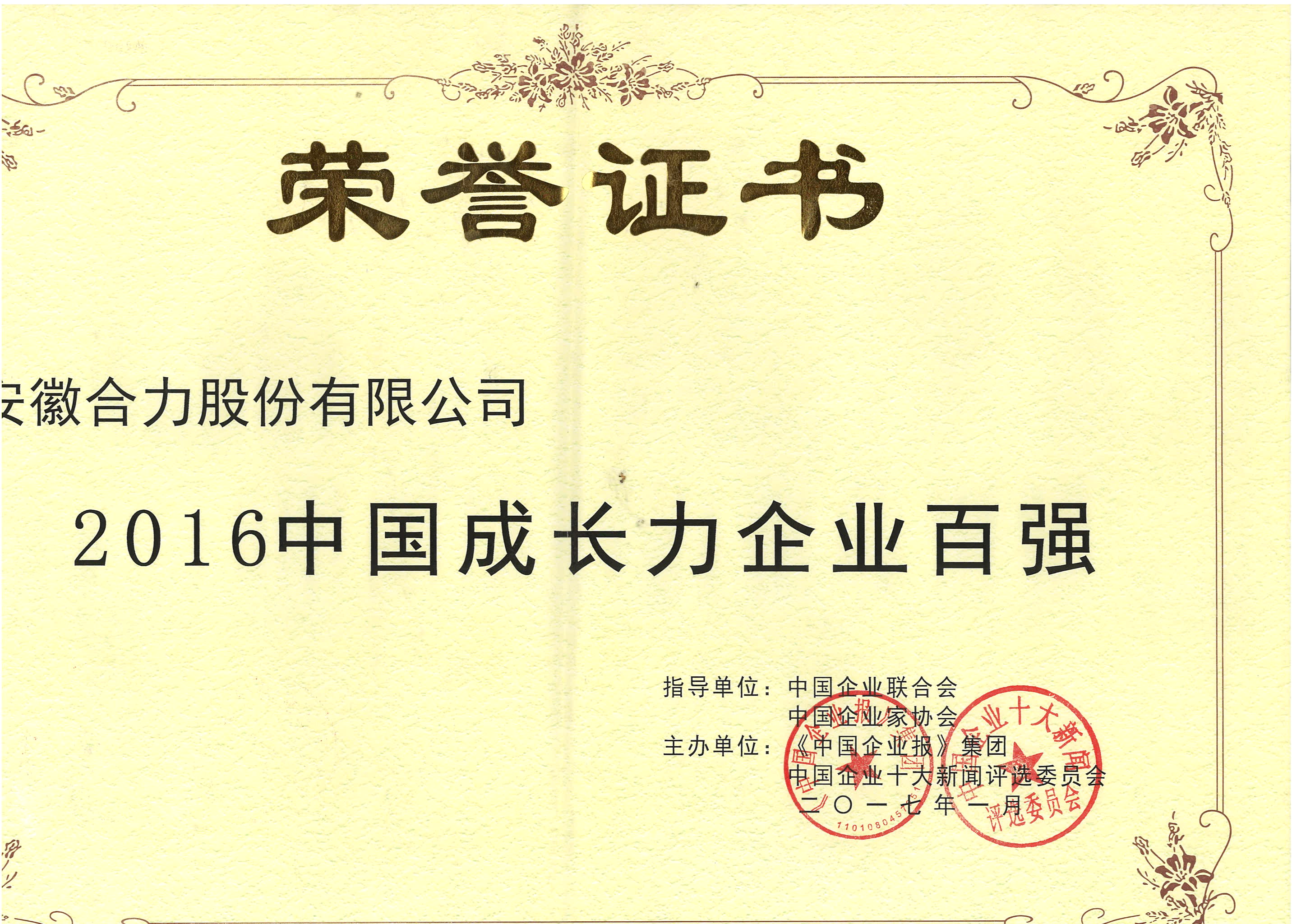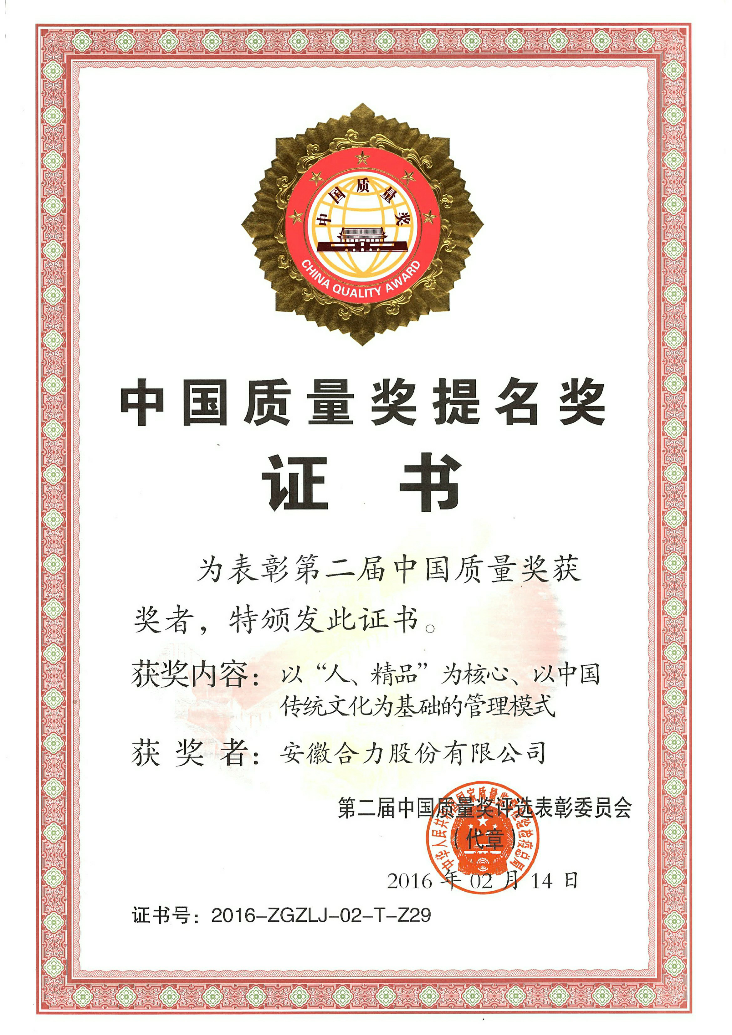 2016 安徽协力股分无限公司中国财产大奖惩处奖