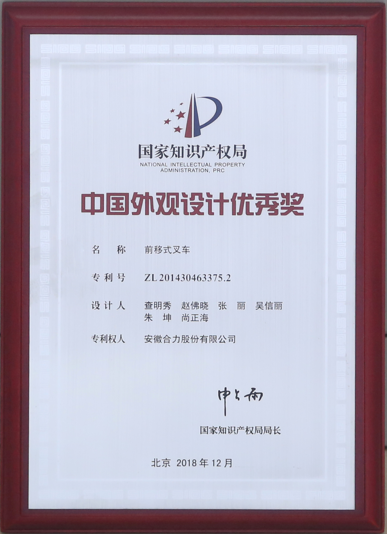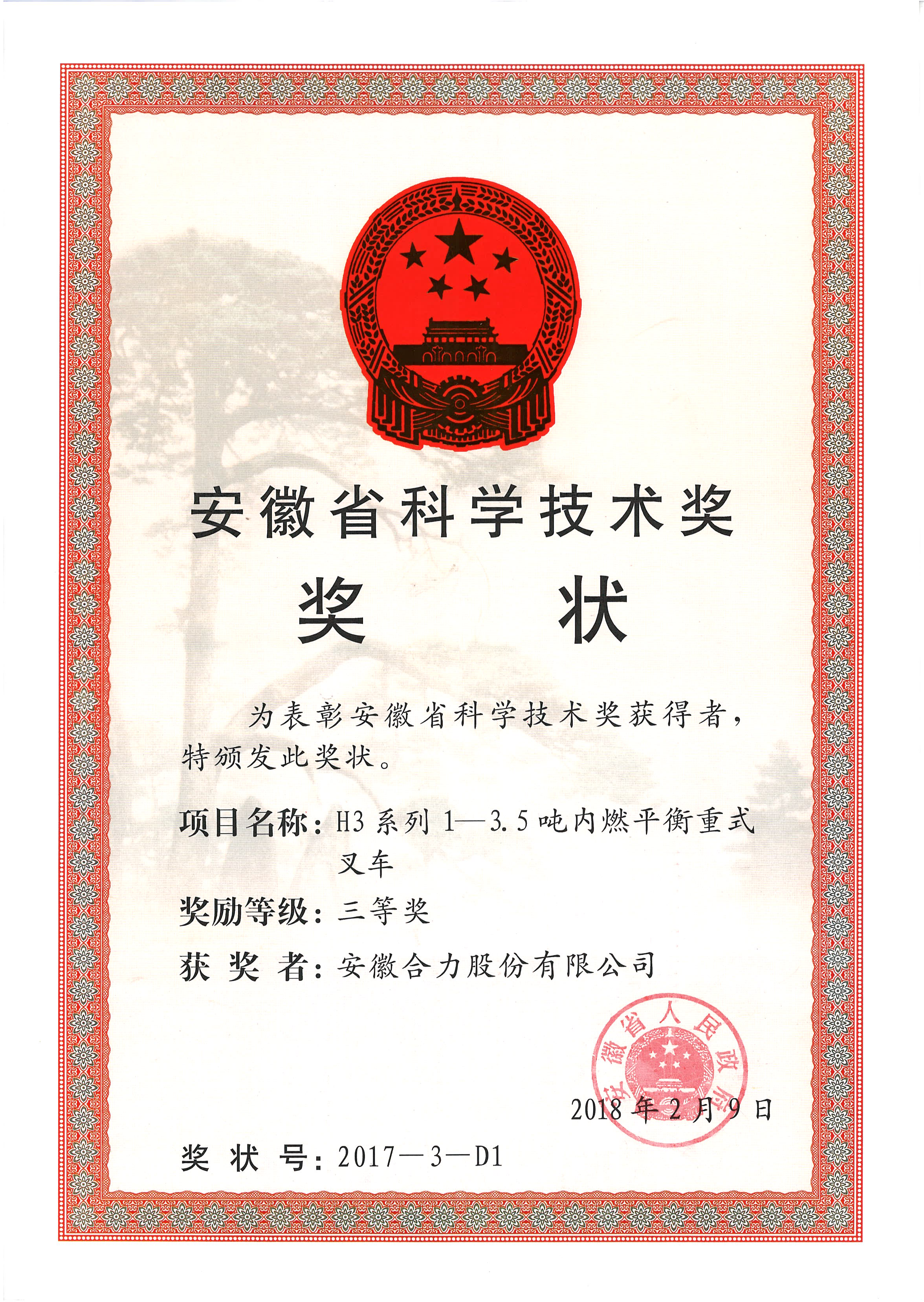 2018 安徽省迷信手艺奖三等奖 H3系列1-3.5吨内燃均衡重式叉车