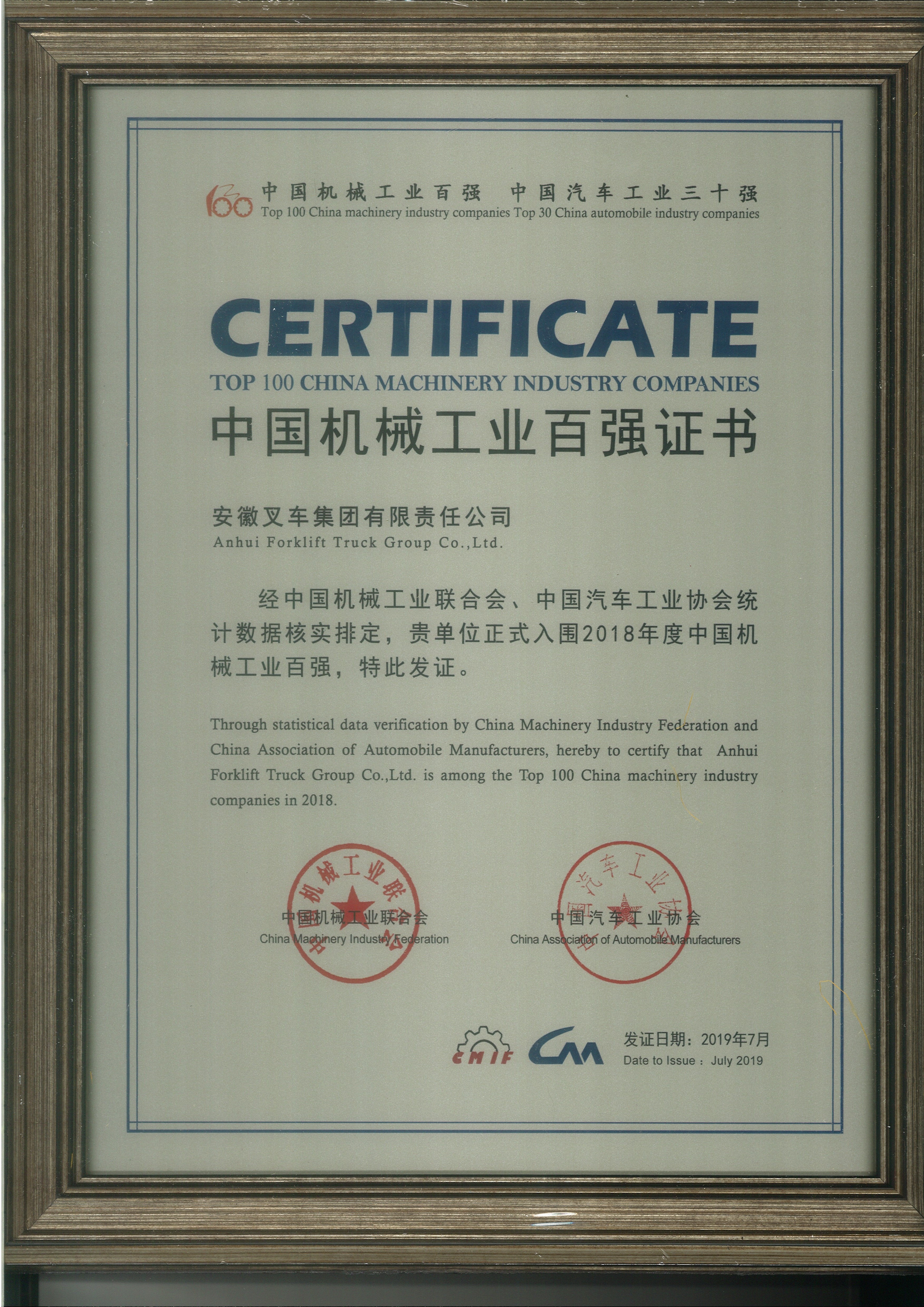 2018 安徽叉车团体无限义务公司2018年中国机器500强